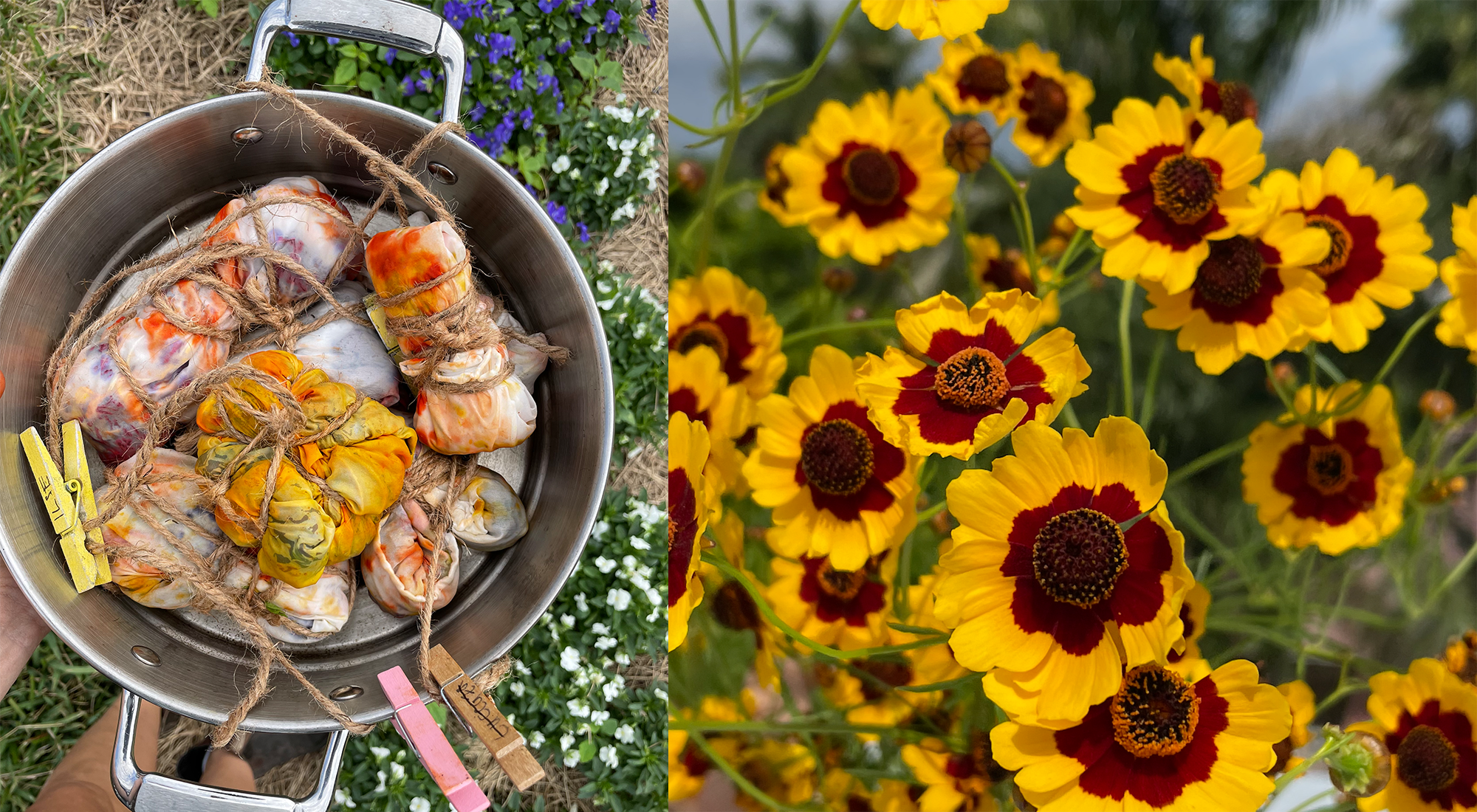 An edible garden isn't just useful for cooking theres lots of other fun activities that a thriving garden can inspire. Last year we hosted our first ever plant dye workshops with local herbalist Sun Sister and they was super fun! We did a simple immersion dye bath made with fresh marigolds and a bundle dyed scarf that we used all sorts of materials for. Bundle dyes are direct pigment transfers so you use super saturated colorful material and the color basically bleeds onto the fabric you are dyeing. We gathered all of the ingredients for this from our family garden like marigolds, turmeric, cranberry hibiscus, purple cabbage leaves, violas, begonias, geraniums, and even red lettuce! Plus we foraged for some wild ingredients like brazilian pepper and bouganvillea blossoms. If you want to give it a try heres a step by step tutorial to do this simple plant project at home.