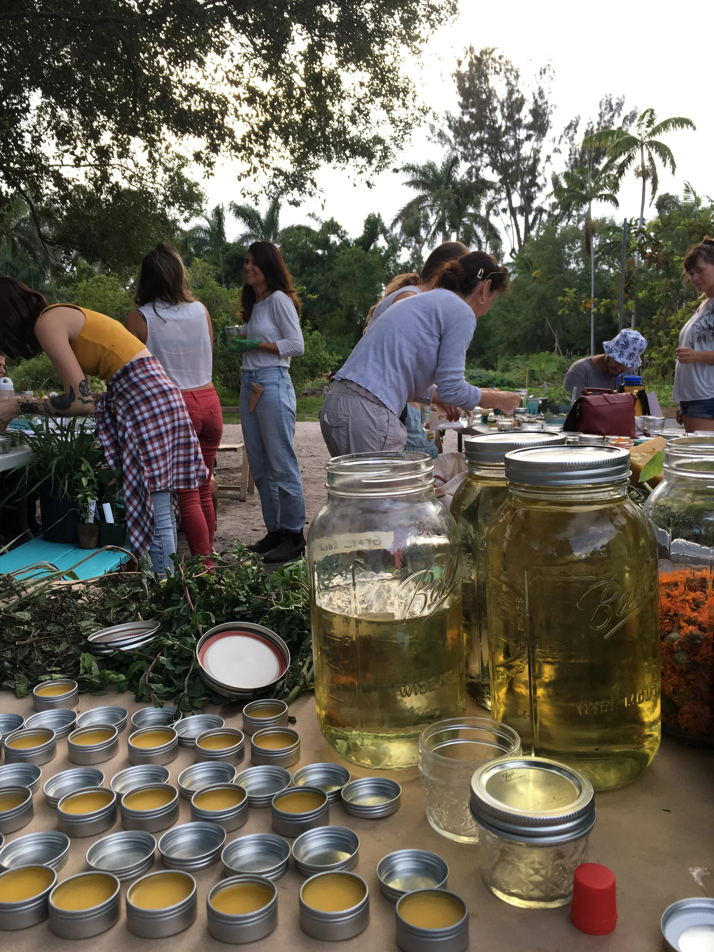 Many of the medicinal plants commonly grown in a home garden are annual flowers and can easily be incorporated into an herb or vegetable garden. Tulsi, lemon balm, anise hyssop and chamomile to name a few, are all easy to grow annual plants that compliment veggie gardening. One of our personal favorites is calendula. Calendula is pretty compact plant in the daisy family, easy to grow from seed (p.s. they have the coolest looking seeds ever). They are fast growing and when the flowers are harvested regularly can be extremely productive. One plant alone can provide a handful of blooms every day for a period of 2-3 weeks, if not more! PRO-TIP: to keep any flowering plant in bloom longer you should prune spent flowers on a regular basis. Pruning flowers encourages the plant to continue producing more fresh blooms. We've been growing calendula and drying flowers for many years. The flowers contain a healing oil with many medicinal uses related to the skin. Muriel first started making a coconut oil based salve to use on her baby's booty for diaper rashes. It is great for sunburns, tattoos, dry lips and many other common skin discomforts. Her salve recipe is simple to make at home. Flowers should be harvested daily and set out to dry. You can lay them out to air dry in a single layer as you collect them; when you have enough to make a batch of oil put them in the oven for 15 minutes at the lowest setting (or even just a warm oven after turning it off) to finish drying them completely. A batch of oil can be any size. Choose a jar to use and fill it with dry flowers, then pour coconut oil to the top to cover the flowers. You'll let it sit in a warm place like a window sill anywhere from 2-6 weeks before straining the oil. Giving a jar a gentle shake (flip the jar unside down a few times gently) every once in a while will help to coax the natural oils in the calendula flowers into the coconut oil. Over time the clear coconut oil will turn yellow or orange. Strain the oil using a tea strainer or a piece of muslin or cheese cloth. The strained oil can actually be used as is, but in order to make it easier to apply, store and carry around it is mixed with a bit of beeswax to get a salve consistency. It's always best to use local organic beeswax which you can find a local farmers market. Put your oil in a small sauce pan on very low heat and add chunks of beeswax, stirring and allowing them to melt, lift your spoon from the oil periodically and allow it to cool so that you can test the consistency of your mixture. When you get a consistency you like stop adding beeswax and pour into a jar or small tins. Your salve will keep for months and makes sweet little gifts for loved ones.